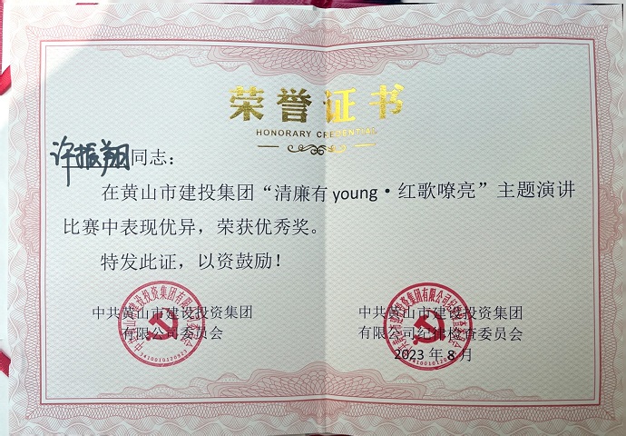 為慶祝中國(guó)共產(chǎn)黨成立102周年,深入推動(dòng)學(xué)習(xí)貫徹習(xí)近平新時(shí)代中國(guó)特色社會(huì)主義思想主題教育,全面貫徹落實(shí)黨的二十大精神,8月18日,由黃山建投集團(tuán)舉辦的“清廉有young·紅歌嘹亮”主題思政課隆重舉行,參賽選手以生動(dòng)的語(yǔ)言、動(dòng)聽的歌聲、真摯的感情為大家?guī)硪粓?chǎng)別開生面的視聽盛宴,黃山建工集團(tuán)青年員工許振翔在思政課演講比賽中取得優(yōu)勝獎(jiǎng)。