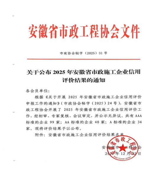 近日,安徽省市政工程協(xié)會(huì)正式發(fā)布《關(guān)于公布2025年安徽省市政施工企業(yè)信用評(píng)價(jià)結(jié)果的通知》。黃山市建工集團(tuán)憑借卓越的綜合實(shí)力、規(guī)范的市場(chǎng)行為、優(yōu)良的工程品質(zhì)及堅(jiān)實(shí)的信用體系建設(shè),成功獲評(píng)最高信用等級(jí)——AAA級(jí)。標(biāo)志著集團(tuán)在誠(chéng)信經(jīng)營(yíng)、履約能力與社會(huì)責(zé)任履行方面獲得了行業(yè)主管部門(mén)與協(xié)會(huì)的高度認(rèn)可,是企業(yè)信用建設(shè)領(lǐng)域的又一重要里程碑。
